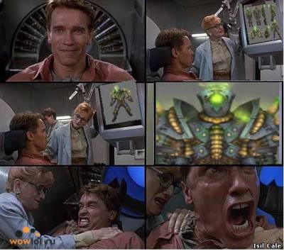 | Рейд бьёт босса. МТ думает: "Блииин, фигасе босс пробивает! Эмердженси кнопки на КД, блиииин, дотяну-не дотяну?" Хил думает: "Блииин, высох совсем, поушен на кд, а МТ пробивают дай боже, хоть бы не уронить!" ДД-кастер думает: "Блиииин, маны нет совсем, а ща адды пойдут, их аоешить надо, а нечем!" Рога думает: "два-два-пять-два-два-пять!"